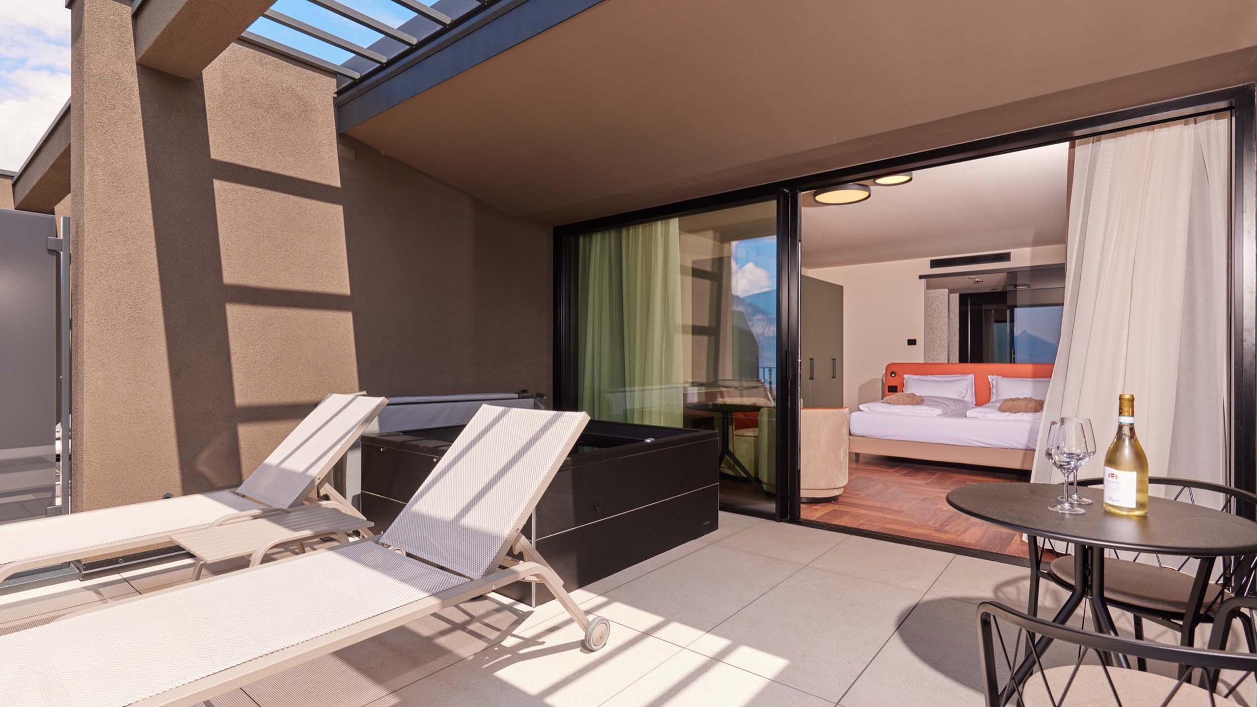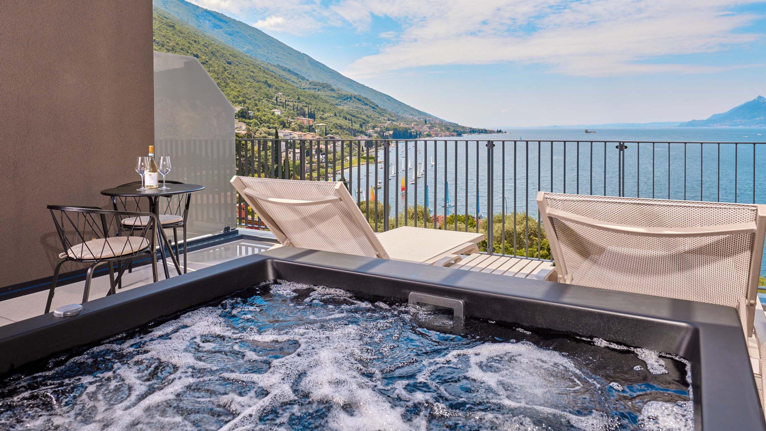 Suite spaziosa con letto king size vista lago ed una zona soggiorno separata con possibilità di aggiungere un terzo o un quarto letto. Nella parte centrale della camera è presente il bagno che dispone di doccia a pioggia, lavabo e area separata per wc e bidet. La zona giorno è attrezzata con confortevole divano e angolo bar con cantinetta vino e macchina per caffè e tè. Sulla terrazza è presente una vasca idromassaggio con arredo da esterno e lettini prendisole. La suite con pavimento in legno dispone di aria condizionata/riscaldamento regolabile, 2 flat TV digitale e SAT, Wi-Fi, telefono, cassaforte, asciugacapelli, e kit cortesia, ovvero borsa wellness con morbidi accappatoi, ciabattine, teli per piscina.